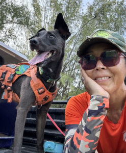 Kyoko’s current focus is canine scent detection. She has competed in various nose work trials, earning “high in trial” with two dogs. Since 2011, she has trained and coached numerous dog & handler teams in scent work skills. In addition to training pet dogs, Kyoko is a conservation detection dog trainer and handler. Past projects include working for a wind farm habitat conservation program which utilized canines to locate seabirds and bats to measure environmental impact; and a pilot study in collaboration with US Fish & Wildlife Service and US Geological Survey, which m